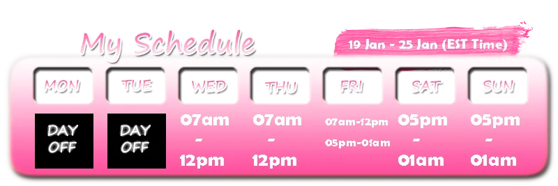 Linguaggio esplicito, Ballo erotico, Esibizionismo, Feticismo dei piedi, Dildo o Vibratore, Anale, Ditalino, Doppia Penetrazione, Pecorina, Facesitting, Istruzioni per sborrare, Masturbazione, Orgasmo, Giocattoli erotici, Pegging, Spogliarello, Twerk, Topless, Tittyfuck, Sculacciate